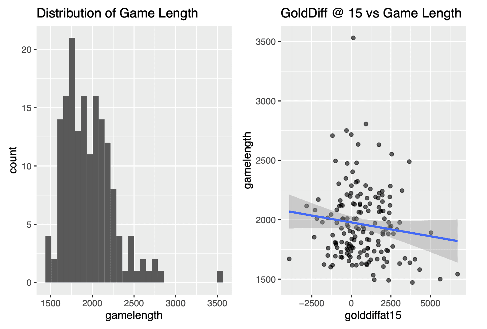 For this project, I analyzed professional League of Legends match data to model and predict game duration using statistical learning methods. After cleaning and structuring a large dataset of international matches, I explored early- and mid-game performance metrics and built multiple predictive models, including OLS, LASSO, and Principal Components Regression. I compared these models using a train–test split and found that LASSO achieved the lowest RMSE by selecting the most informative predictors and reducing multicollinearity. The results highlight how a small set of tempo-driving variables, such as kill pace and objective control, can reliably forecast match length.